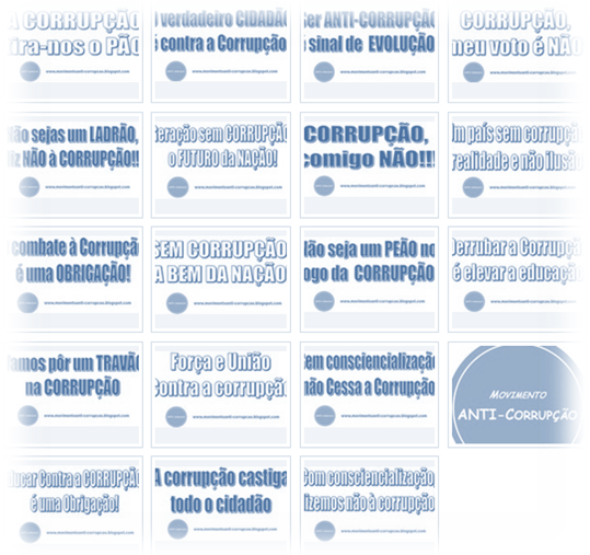 As imagens estão disponíveis no separador "Frases de Ordem" próprio aqui do blogue, podem e devem ser utilizadas e divulgadas tendo como intuito contribuir para o reforço da consciencialização para o papel dos cidadãos face à corrupção.